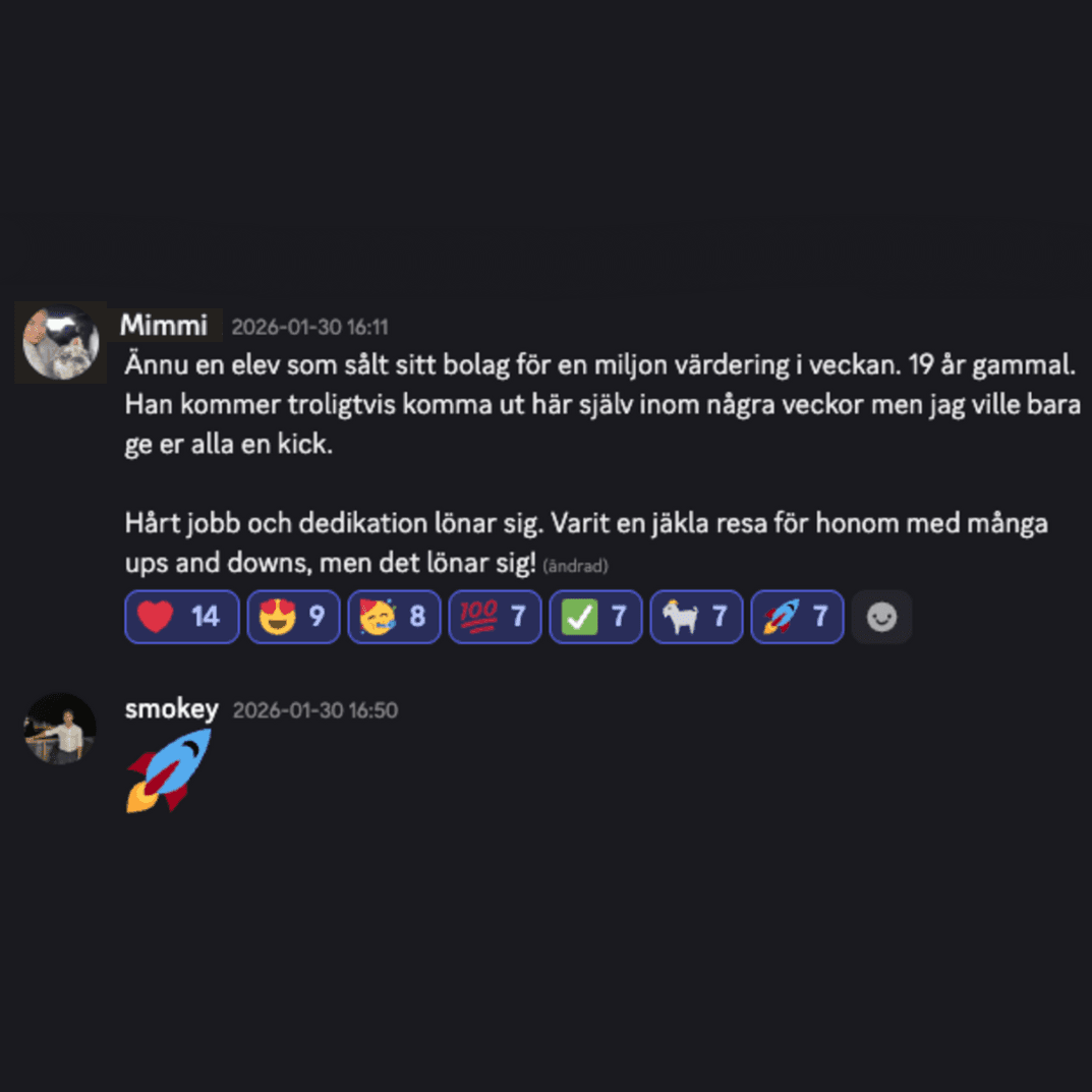 Två år efter att utbildningen skapades ser jag tillbaka på resan med en helt annan känsla än jag hade kunnat föreställa mig från början. Det som började som ett sätt att dela erfarenheter har vuxit till något mycket större — ett sammanhang där jag har fått lära känna människor som idag är vänner för livet. Jag har fått se otroligt många unga, vilsna personer hitta riktning, bygga något eget och nå mål som en gång kändes långt borta för dem själva. Vi har träffats på events, följt varandras resor och fått se hur människor utvecklas — inte bara i sina bolag, utan som personer. Det är svårt att sätta ord på känslan av att få vara en liten del av den utvecklingen. Idag känner jag framför allt stolthet. Inte över siffror eller resultat, utan över människorna, gemenskapen och alla liv som på något sätt har påverkats i en positiv riktning.